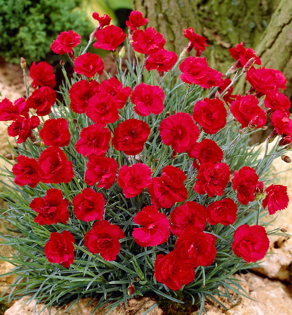 Саженцы гвоздики гратианополитанской (серо-голубой) Дезмонд (Diantus gratianopolitanus Desmond) используются в оформлении бордюр, альпинариев. Растение вырастает не более 30 сантиметров в высоту. Листочки гвоздики плотные, длинные, имеют характерный серо-голубой цвет. Яркие, рубиново-красные, бархатистые цветки появляются в июне. Диаметр цветка – 3-4 сантиметра. Обладают приятным ароматом. Для обильного яркого цветения лучше высаживать гвоздику на максимально солнечных участках. Почвы – плодородные, предпочтительно рыхлые, с хорошим дренажом. Условия полива – умеренные.