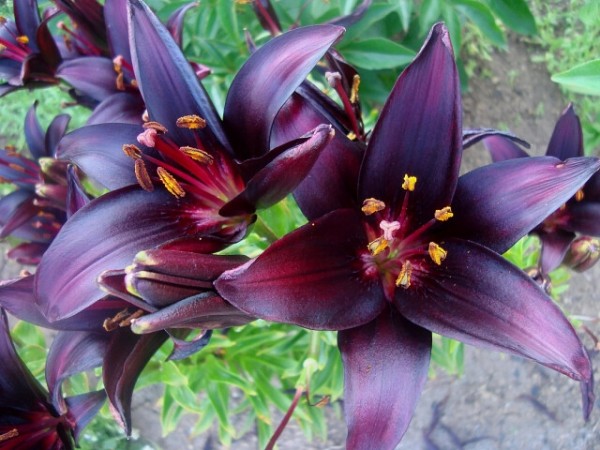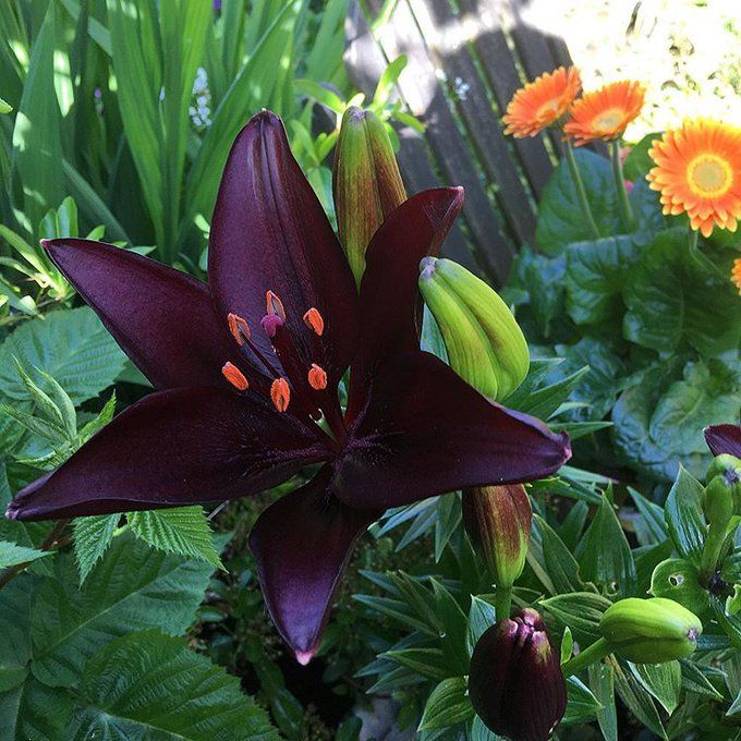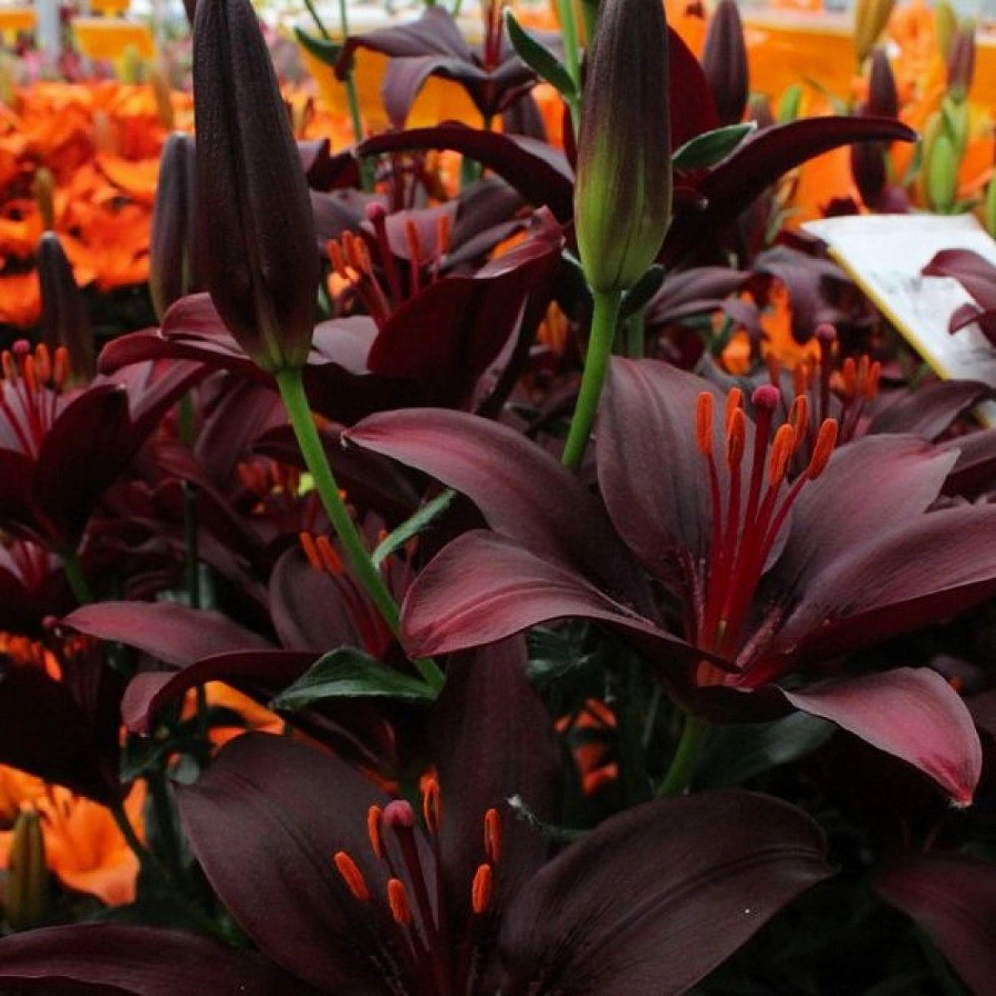 Луковицы лилии азиатской Дарк Секрет (Dark Secret) уместно разместить для контраста на клумбе с преобладанием белых цветов. Растение обладает крупными бутонами насыщенного вишнево-бордового цвета, отливающего синевой. Длинные пурпурные тычинки с оранжевыми головками только подчеркивают глубокий оттенок лепестков.