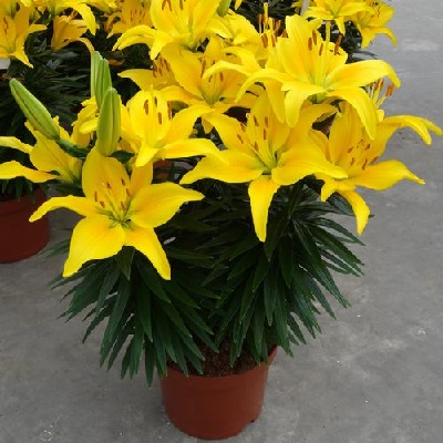 Лилия азиатская горшечная Тайни Би - это настоящее чудо природы, которое поразит вас своей красотой и изяществом. Ее стебель прочный и устойчивый, достигает высоты до 45 см, а цветки радуют глаз своей яркой желтой окраской с темно-оранжевыми крапинками по центру. Листья лилии имеют зеленую окраску и элегантную форму, что делает растение еще более привлекательным.