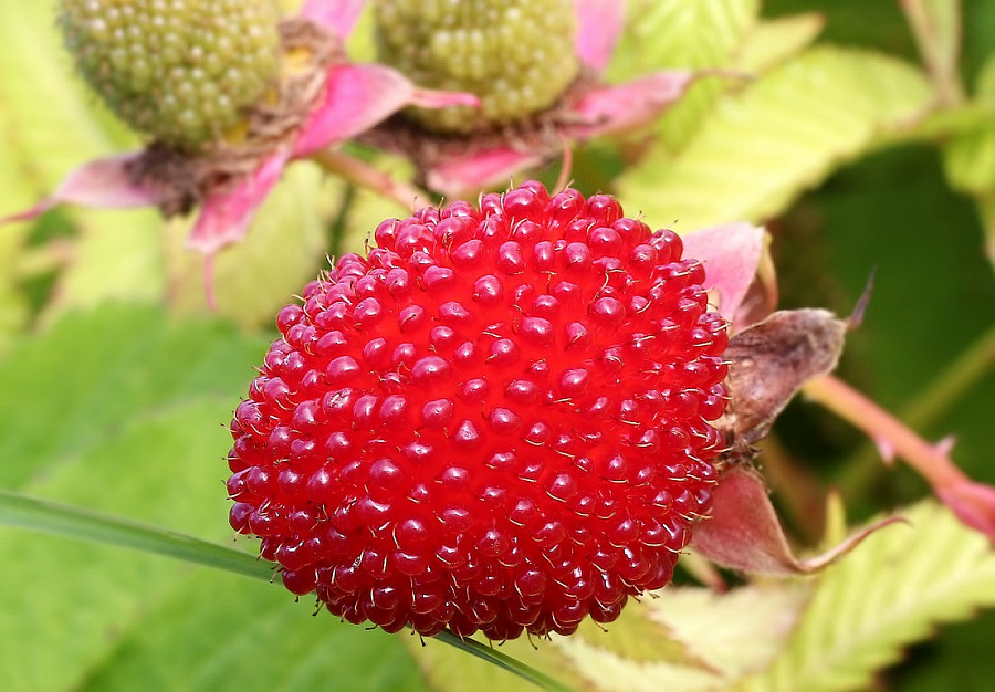 Саженцы малины розолистной (Rubus Illecebrosus) высаживают в дренированный плодородный грунт на солнечном участке сада. Взрослый куст достигает 90-100 сантиметров в высоту. Весной распускается белыми цветами, а летом активно плодоносит. Характеризуется высокой декоративностью. Гофрированные листья и ярко-бордовые ягоды, размером до 3 сантиметров, станут украшением участка. Плоды отдаленно напоминают клубнику, но на малину все-же похожи больше. Цветы распускаются одновременно с созревающими ягодами, которые всегда предпочитают «смотреть» вверх, не скрываясь под листвой.