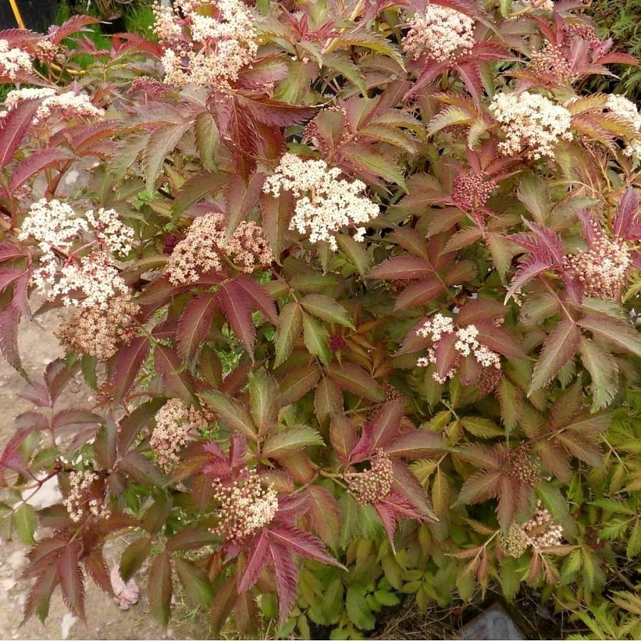 Саженцы Бузины черной Серенада (Sambucus nigra) – лиственный декоративный плодовый куст, высотой 250 сантиметров. Отличается медленным ежегодным приростом. Крона его плотная, широкая, около 150 сантиметров. Сорт привлек внимание садоводов на фоне своих декоративных побегов розового окраса. Листья в начале лета желто-зеленого тона, к осени превращаются в розово-красные. Цветки собраны в бутоны, розового окраса. Кустарник цветет в мае-июне. Плоды созревают в сентябре, шаровидные, черные, блестящие, съедобные. Растение лучше себя чувствует на солнечной местности. В тени теряет декоративность. Не привередливо к почве. Морозоустойчиво.
