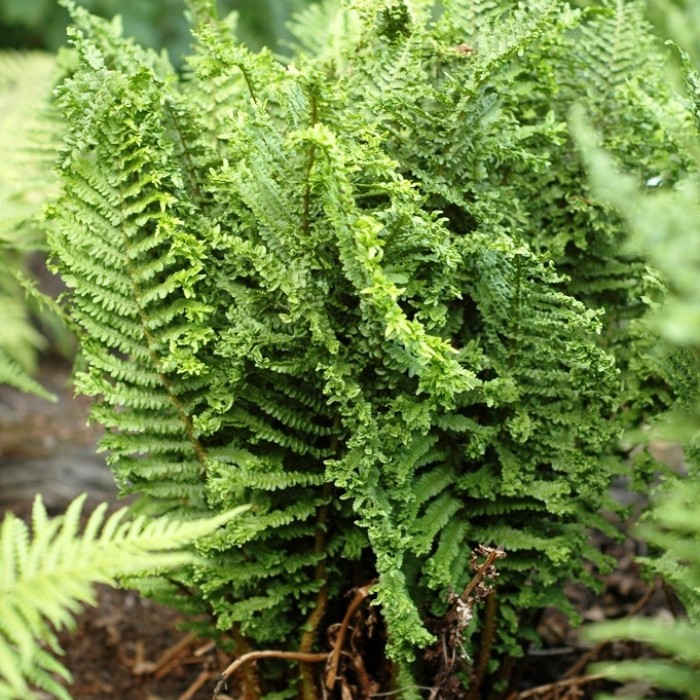 Щитовник мужской Crispa Cristata - растение от 50 до 150 см высотой с простым корневищем и зимующими листьями, собранными в плотные розетки.Листья длиной 20 - 80 см, продолговатые, темно-зеленые, с нижней стороны более светлые, перистосложные, глубокоперисторассеченные.Отдельные части сильно курчавые и обильно ветвящиеся. Издалека щитовник мужской Crispa Cristata напоминает крупный пучок петрушки. Главная особенность сорта — листья сохраняются на зиму и отмирают весной по мере отрастания молодых.Споры созревают в средней полосе в июле.